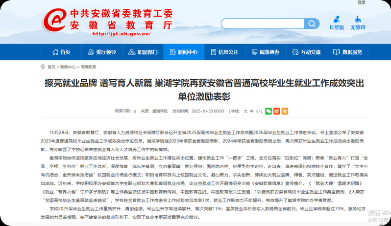 【安徽教育网】擦亮就业品牌 谱写育人新篇 Beat365唯一官方网站再获安徽省普通高校毕业生就业工作成效突出单位激励表彰