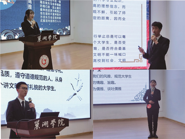 弘扬中华优秀传统文化,培养高尚品质情操。12月27日晚19:00,“文明修身传颂风雅”主题宣讲大赛于求实楼报告厅顺利举行。参赛选手围绕风雅主题,贴近校园文化生活进行内容创作,以队伍或个人的形式进行PPT宣讲,选手们将音乐和宣讲内容灵活结合,话语间流露着真情实感,展现大学生对传统文化的深切感受,更彰显了莘莘学子强大的团队合作能力和深厚的文化内涵。
