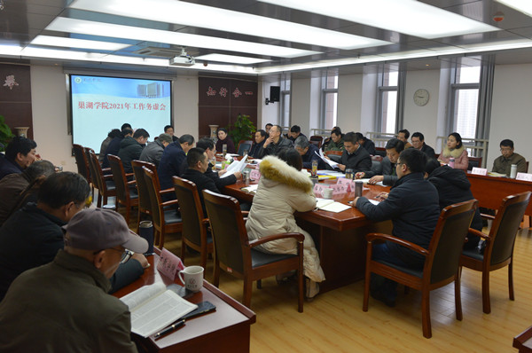 围绕深入学习贯彻党的十九届五中全会精神,推动学校高质量发展,进一步夯实建设高质量教育体系基础,谋划好、落实好学校“十四五”时期和2021年各项工作,祝家贵着重从六个方面作出了部署和强调。一是坚持把立德树人作为根本任务。要全面落实立德树人根本任务,把立德树人成效作为检验学校一切工作的根本标准,真正做到以文化人、以德育人,不断提高学生思想水平、政治觉悟、道德品质、文化素养,做到明大德、守公德、严私德。二是完善“五育并举”的育人体系。要聚焦育人体系建设,把思想政治教育贯穿育人工作始终,完善长效协同育人体制机制,坚持德育为先,德、智、体、美、劳五育并举,不断完善人才培养体系,促进学生全面发展、健康成长。三是推进学校治理体系和治理能力现代化。要不断深化教育综合改革,持续释放办学治校活力,激发师生员工干事创业、攻坚克难的内生动力。四是建立务实有效的教育评价体系。要坚决破除不科学、不合理的教育评价体制机制,树立正确导向,健全有效杠杆,建立科学合理的教育质量评价体系。五是建设高质量的师资队伍。要把师资队伍建设作为学校一项基础工程,不断提高师资队伍的专业化水平,优化教师队伍结构,建设一支师德高尚、业务精湛的教师队伍。六是进一步增强服务社会的能力。要坚持应用型办学定位,主动加强与地方政府、企事业单位的联系沟通与交流协作,持续推进服务环巢湖区域经济社会发展行动计划、环巢湖文化塑校育人工程和“一院一镇一品”志愿服务工程落实工作。