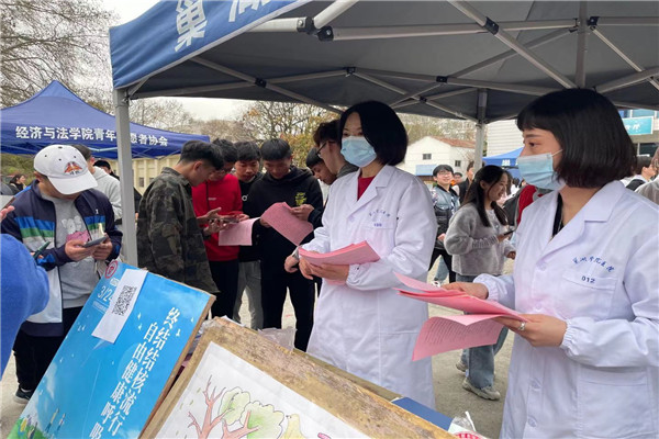 宣传周活动现场,卫生专业技术人员通过搭设展台及咨询台,向同学们普及结核病的防治知识。青年志愿者联合会的志愿者向同学们发放宣传资料,引导同学们了解结核病的防治知识。现场陈列悬挂了结核病防治知识的展板和横幅,营造的良好的宣传氛围。此次活动推出为期三天的线上微信有奖答题活动,受到了同学们的热烈响应,大家纷纷扫码答题,宣传气氛生动活跃。