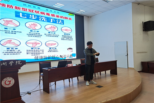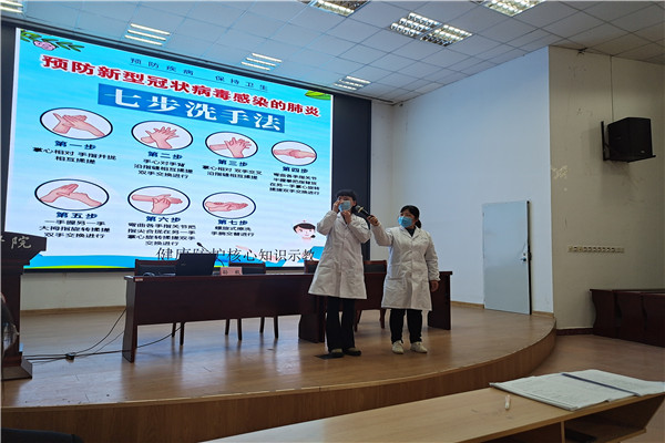 进一步普及结核病及新冠肺炎等常见呼吸道传染病的防治知识,活动特别设置了“健康防护知识”现场示教环节,校医院的专业技术人员刘雅婷、袁玉分别进行了“七步洗手法”“正确戴口罩”“咳嗽、发喷嚏礼仪”等呼吸道传染病防护的实用技能演示,同学们现场观摩后,跃跃欲试,上台与宣传人员互动,大家感叹,看似简单的操作,经过规范的学习之后获益良多。