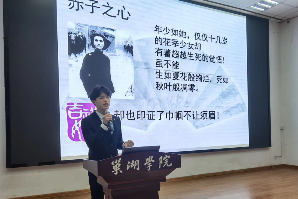 为庆祝中国共产党成立100周年,展现中国共产党团结中国人民不忘初心、牢记使命、艰苦奋斗的百年光辉历程,歌颂革命战争时期巾帼英雄先进事迹,3月19日晚19:00,由校团委、学生会举办的第十五届女生节“励志芳华展”之红色故事我来讲主题演讲比赛在求实楼报告厅举行。大赛邀请巢湖团市委,我校教务处、团委、学生会相关人员担任评委。