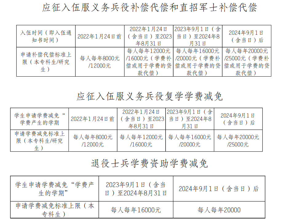国家对应征入伍服义务兵役、直招军士(原士官,下同)的高校学生,在入伍时对其在校期间缴纳的学费实行一次性补偿或用于学费的国家助学贷款实行代偿;对应征入伍服兵役前正在学校就读的学生(含新生),服役期间按规定保留学籍或入学资格、退役后自愿复学或入学的,实行学费减免;对退役后,自主就业,通过全国统一高考或高职分类招考方式考入本校并报到入学的新生,实行学费减免;2025年在校的全日制退役士兵学生按照实际情况享受本专科生国家助学金。