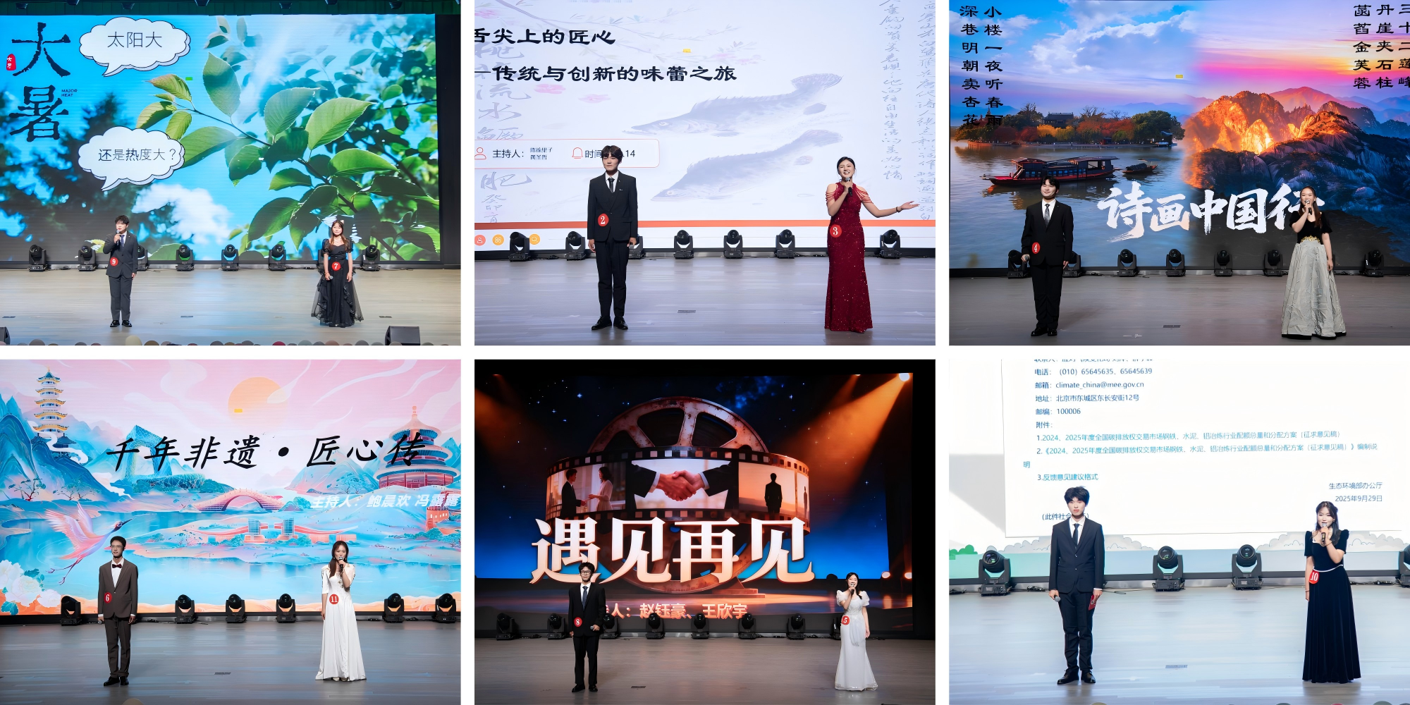 在模拟主持环节,选手们自由组队,围绕不同主题打造特色节目——《聚焦生态》《青春之声,荷你有约》《舌尖上的匠心》《诗画中国行》《千年非遗匠心传》《遇见,再见》,节目亦各具特色,选手们精准的角色定位、流畅的串联衔接,展现了扎实的主持功底。