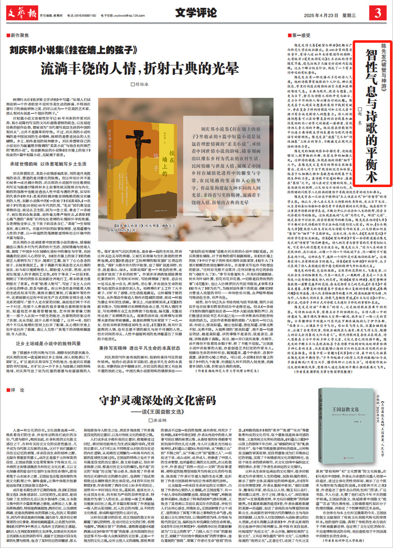 赵东教授在《文艺报》2025年4月23日第3版发表题为《陈先发<破壁与神游>:智性气息与诗歌的平衡术》的研究成果。
