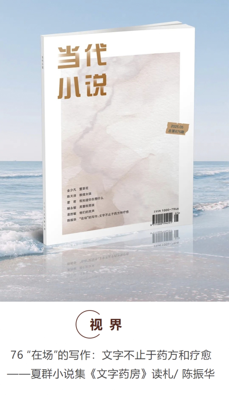 陈振华教授在《当代小说》2025年第5期发表题为《“在场”的写作:文学不止于药方和疗愈——夏群小说集<文字药房>读札》的评论文章。