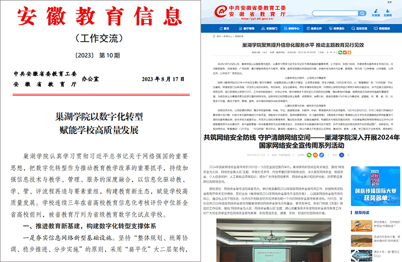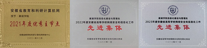学校近年来高度重视信息化发展,深入推进智慧校园内涵建设,强化信息技术与教育教学深度融合,构建教育新生态,助力提升人才培养质量。近3年在安徽省高校教育信息化考核评价中始终位居全省高校前列,连续7年被安徽省教育和科研计算机网、安徽省网络安全与信息化协会评为“先进主节点”“先进用户单位”“先进集体”,2022年被省教育厅列为省级教育数字化试点学校。学校多次被省内外高校、省部级交流会邀请分享信息化建设经验,学习强国、安徽日报、安徽青年报、安徽教育网等媒体多次报道学校信息化工作事迹,省委教育工委《安徽教育信息》2023年专题报道学校数字化转型举措与成效。