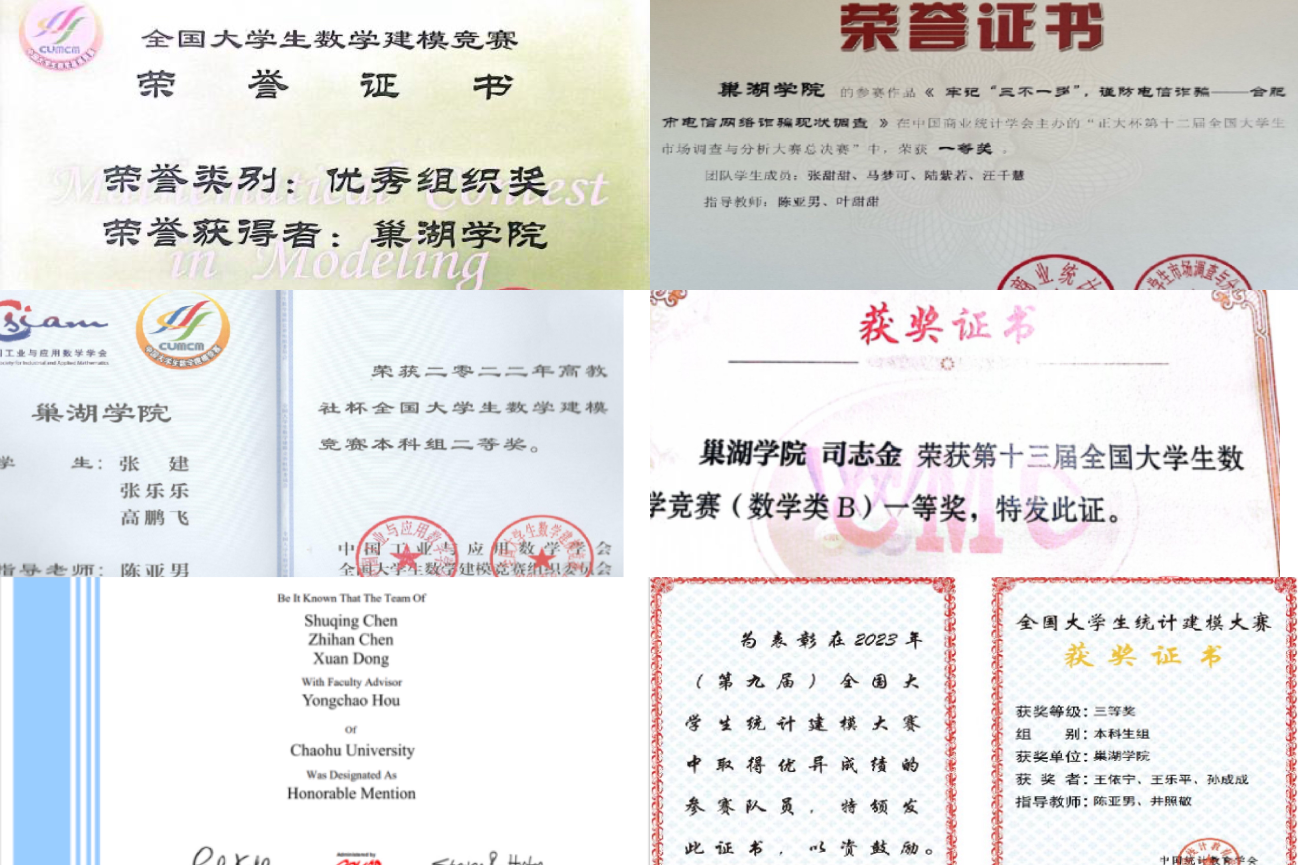 学院鼓励引导学生参加各类学科竞赛,坚持“赛”“会”一体,依托全国大学生市场调查与分析大赛、统计建模大赛、数学建模大赛等顶级大赛,精心打造数学建模协会、市场调查与分析协会等2个协会,选拔骨干教师担任社团指导教师,坚持以赛促学、以赛促练、以赛强基、以赛提能。2024年9月数学建模协会获评五星级社团(第一名)。学生获奖人数、获奖级别屡创新高。学生四年内生均参加各类比赛2.43次。2022年在“高教社”杯全国大学生数学建模竞赛获全国二等奖1项,安徽省二等奖3项、三等奖8项。2023年数学建模团队获得安徽省赛区一等奖2项、二等奖4项、三等奖10项的优异成绩,并获得安徽赛区优秀组织奖,另有2位老师获得省级优秀指导教师。2024年学生在美国大学生数学建模竞赛中获得国际一等奖1项、二等奖2项。近几年学生获得全国市场调查大赛国家级一等奖1项、二等奖和三等奖多项,位居省属高校前列。2023年学生荣获统计建模比赛国家三等奖1项。学院重视科研育人,近三年以来学生发表学术论文12篇,其中 SCI/SSCI等一类论文4 篇。坚持服务地方,充分发挥应用统计学、大数据管理与应用学科专业优势,与科大讯飞等多家企业开展深度校企合作。学院多次获得就业创业先进集体,其中考研等高质量就业率约为学校平均水平的2倍。