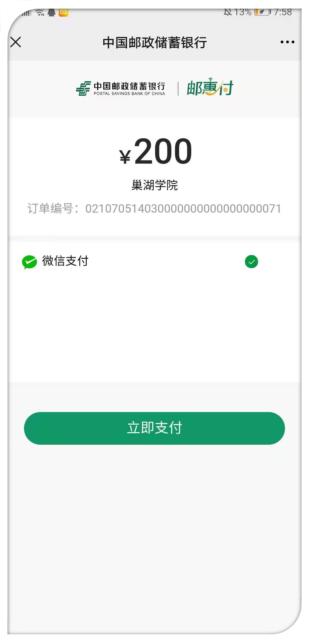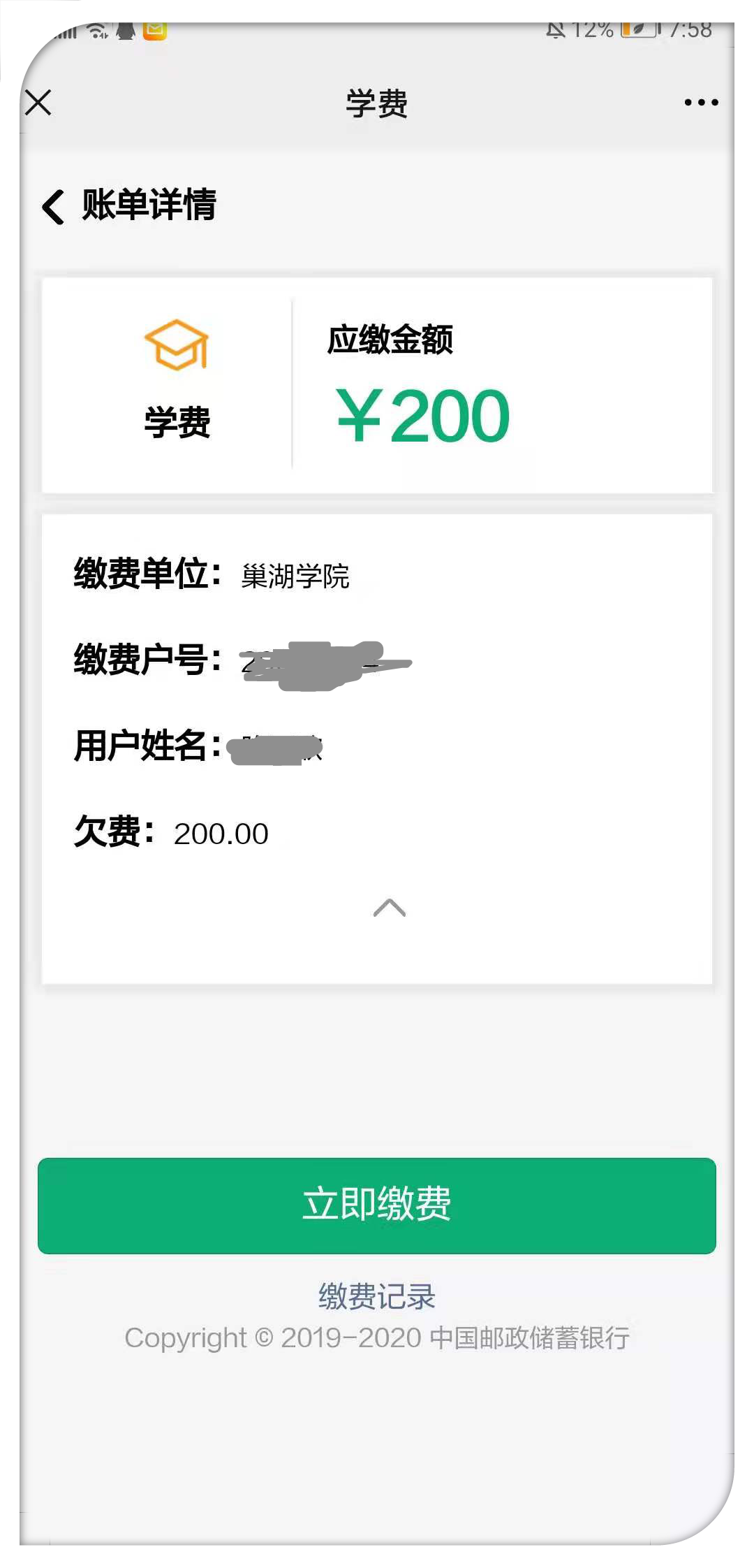 3.进入应缴欠费页面后,页面显示欠费金额,核对姓名和学号无误后,点击“立即缴费”,进入支付页面后,选择“微信支付”,点击立即支付即可完成缴费。