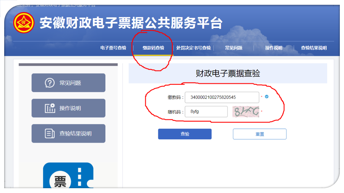 6.进入安徽财政电子票据公共服务平台后,选择“缴款码查验”,输入“缴款码”,和“随机码”,点击“查验”按钮。
