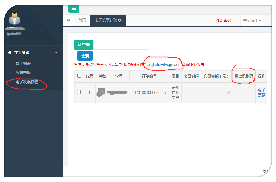 5.登录后进入网上缴费系统以后点击“电子发票获取”按钮后,一般缴费完成后,第五天在电子发票获取栏中出现缴款识别码,复制缴款识别码,点击“czpj.ahzwfw.gov.cn”网址进入安徽财政电子票据公共服务平台。
