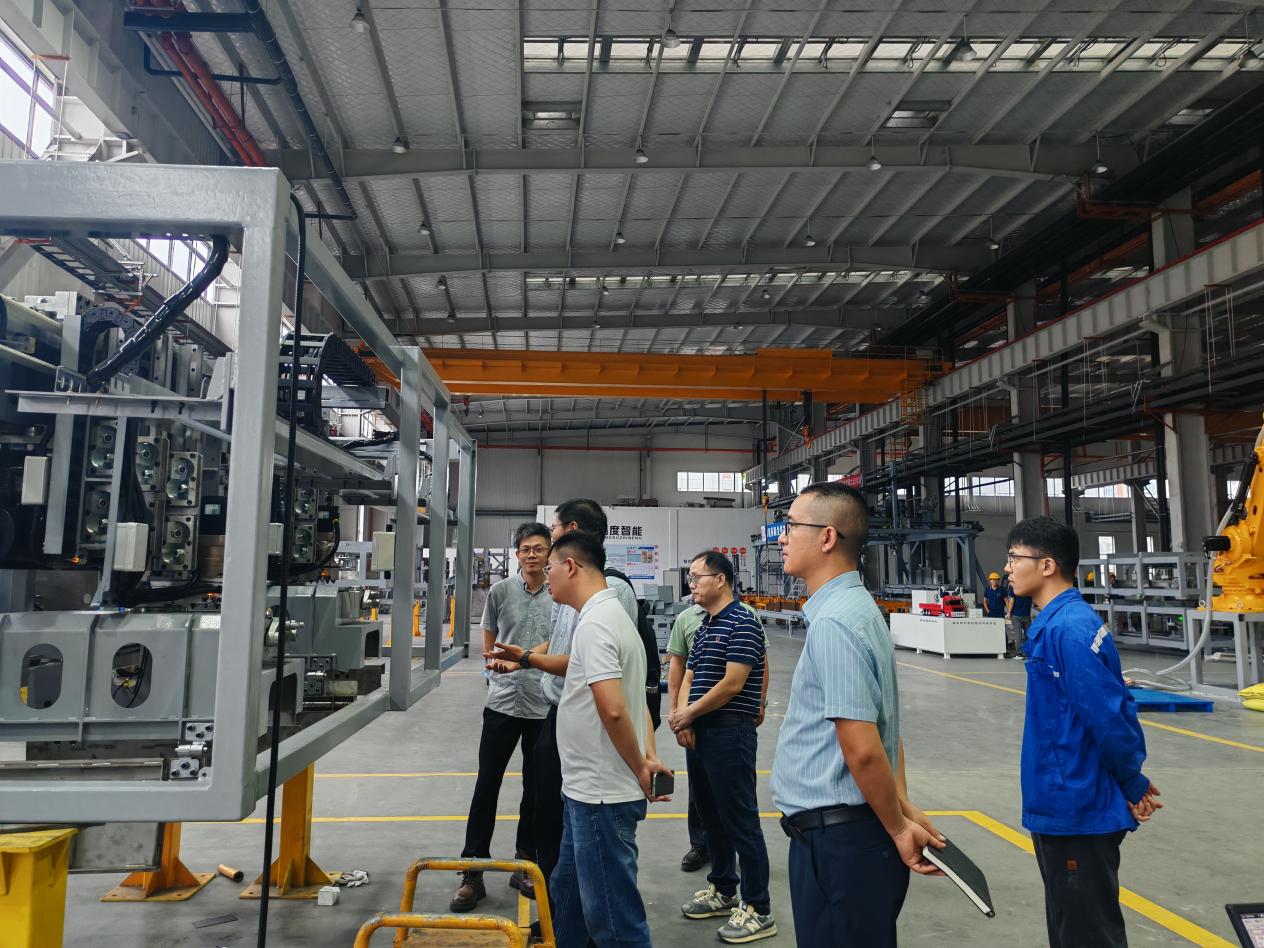 方愿捷一行还参观了企业智能化生产车间,观摩了智能搬运管控系统、全链路机器视觉应用系统、机器人及自动化设备等智能系统、核心设备的生产调试流程。