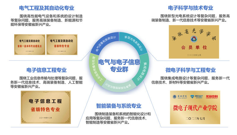 学院现有电气工程及其自动化、电子信息工程、电子科学与技术和微电子科学与工程、智能装备与系统5个招生专业,形成服务十大新兴产业的特色专业群。获批省级一流本科专业建设点1个(电气工程及其自动化),省级特色专业2个(电气工程及其自动化、电子信息工程),省级“卓越工程师教育培养计划”专业1个(电子信息工程),国家级大学生校外实践教育基地项目、省级人才培养模式实验区、省级实训示范中心、省级微电子现代产业学院各1个。实验中心建筑面积约6000多平米,仪器设备总值3100多万元。