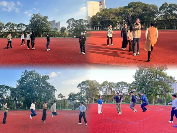 激情跃动燃秋意,教职工们身姿矫健,有的双手快速摇绳,脚尖轻盈点地,如飞燕穿梭;有的专注节奏把控,即使偶有失误仍坚持到底,现场加油声与欢笑声交织成一片。集体跳长绳项目将气氛推向高潮,各部门组成2-4人战队,轮番上场展示,摇绳队员奋力挥臂划出流畅弧线,跳绳队员鱼贯而入、步调一致,默契的配合引得观众阵阵喝彩。