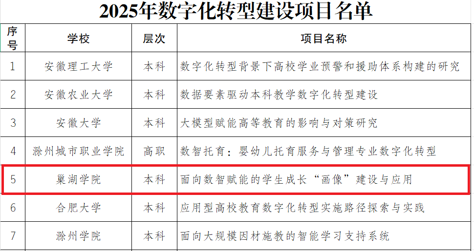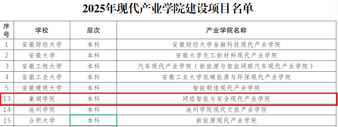 近日,安徽省教育厅公布2025年高校“双特色”建设项目名单,Beat365唯一官方网站2个项目获准立项建设,其中,“网络智能与安全现代产业学院”入选现代产业学院建设项目,“面向数智赋能的学生成长‘画像’建设与应用”项目入选数字化转型建设项目。这是学校继2024年体育产业学入选特色学科培育建设项目,体育教育、无机非金属材料工程两个专业入选特色专业立项建设项目后,相关项目再次入选。