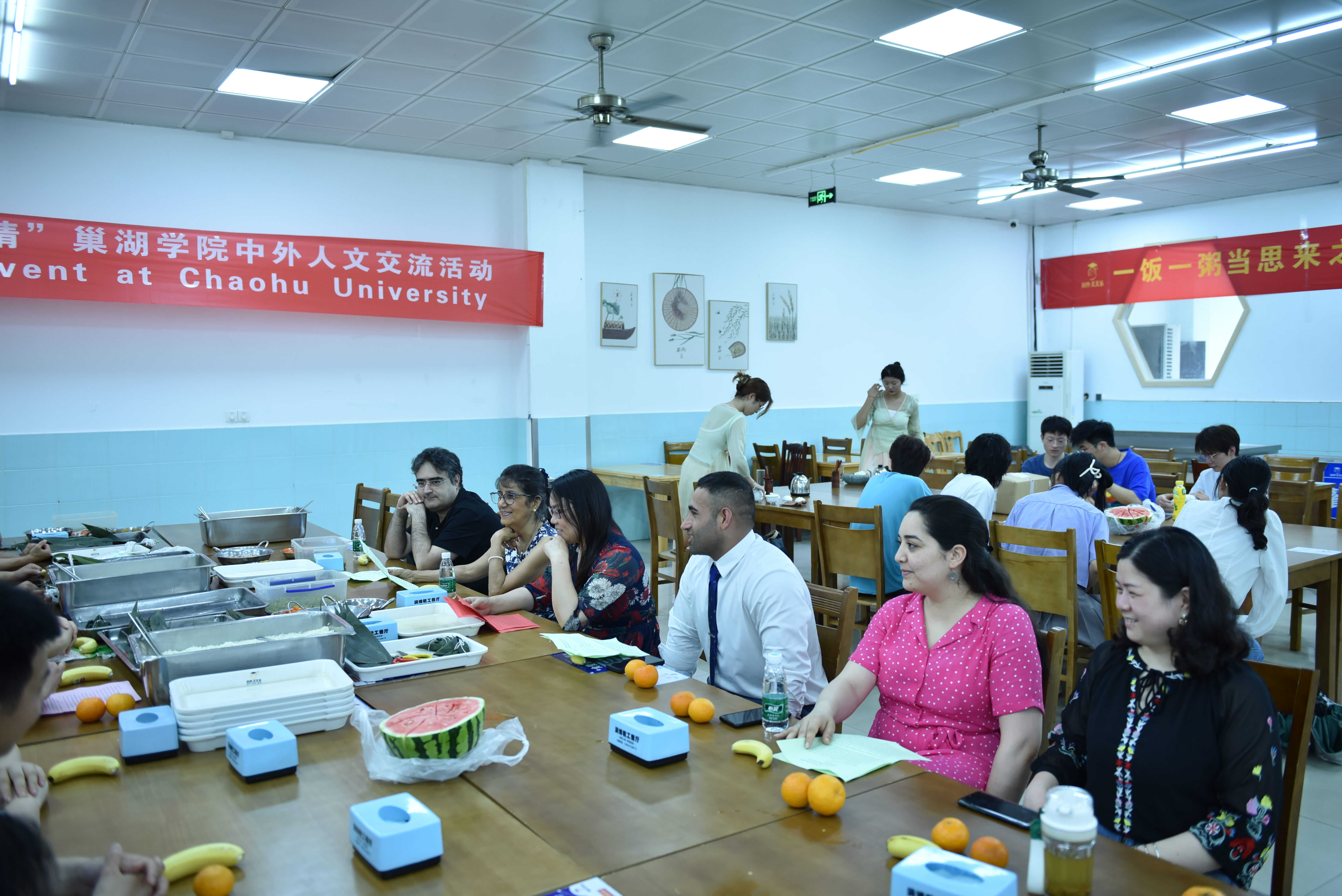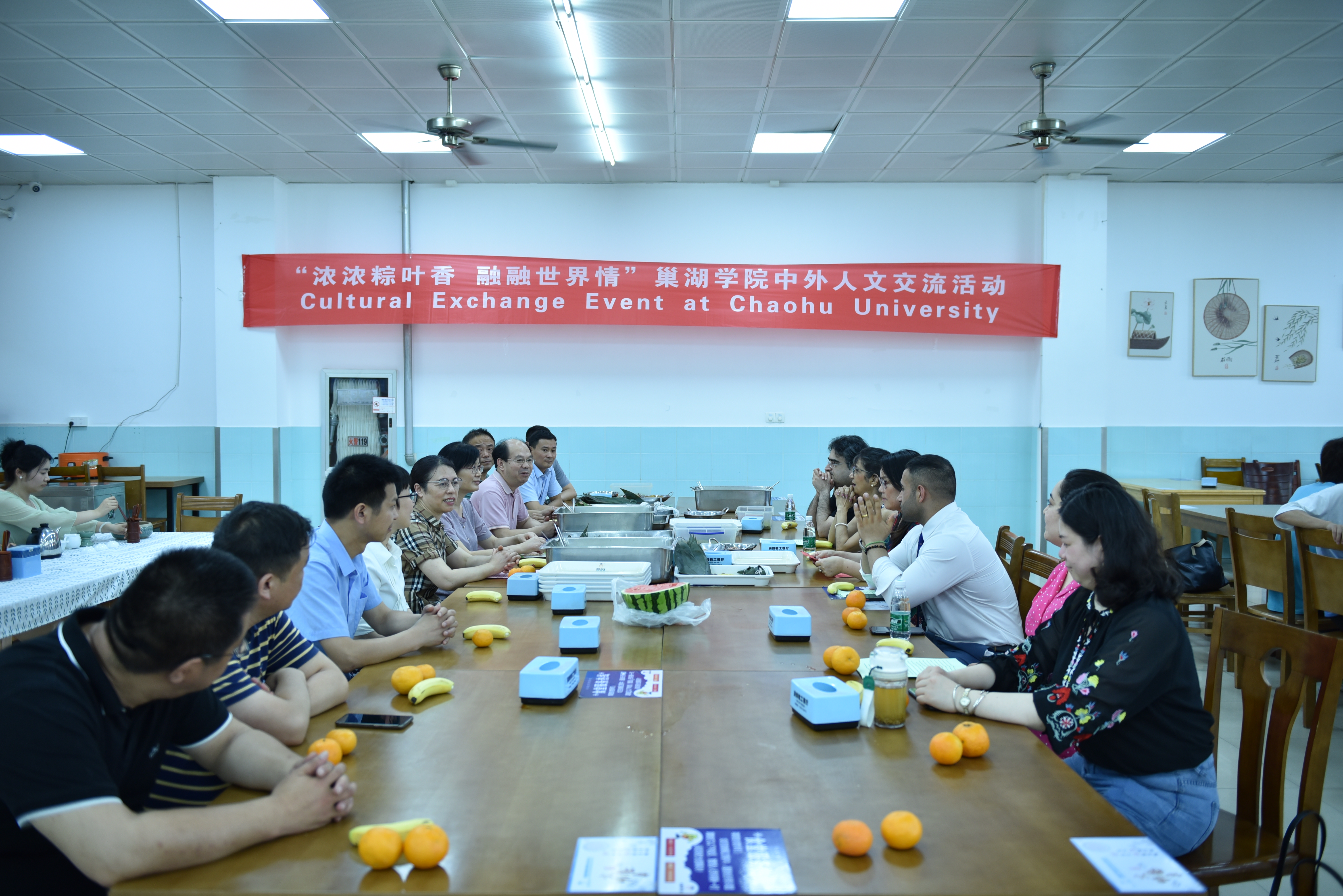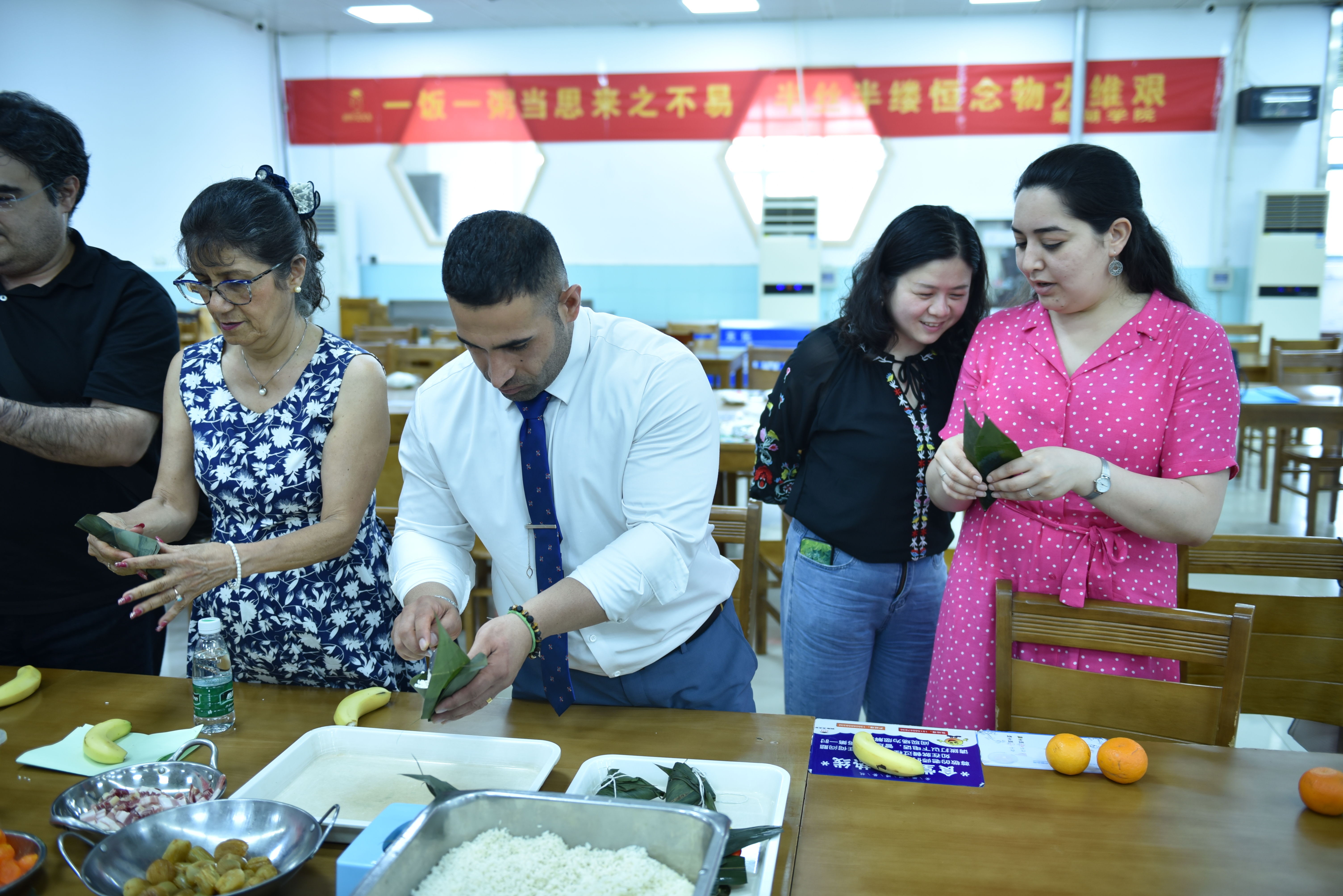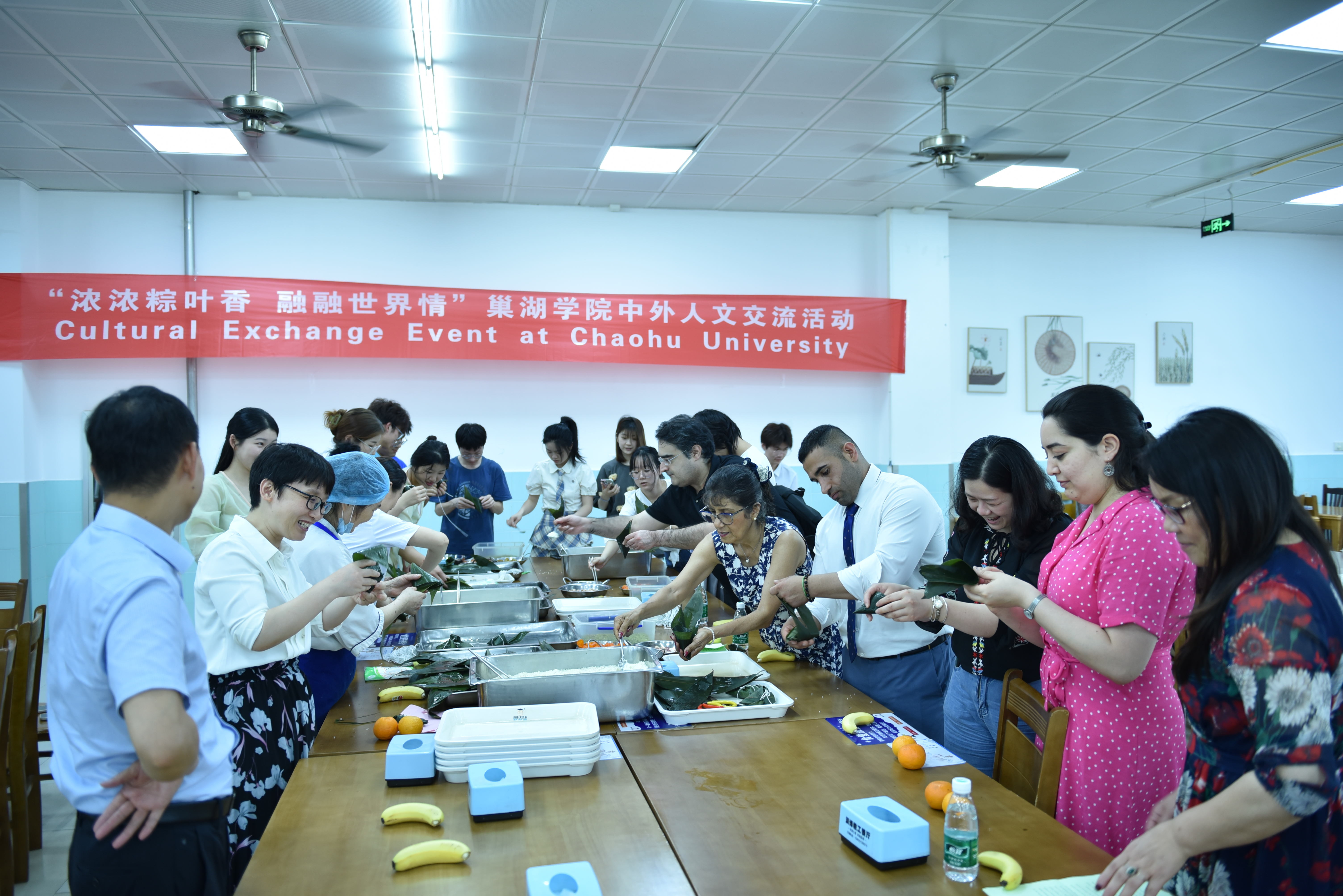 为加强我校对外开放办学,扩大中外人文交流,让外籍教师感受中国传统文化的博大精深,有效促进中外师生之间的友谊与合作,彼此更好地了解异国文化,6月21日下午,学校在教工餐厅举办一场主题为“浓浓粽叶香 融融世界情”中外人文交流活动。活动由国际交流与继续教育学院、工会主办,宣传部、人事处、办公室、教务处、后勤处、旅游管理学院、外国语学院以及中外合作办学办公室协办。校党委委员、副校长朱定秀出席了会议,各单位负责人、外籍教师以及中外合作项目班的师生代表参与了人文交流活动。