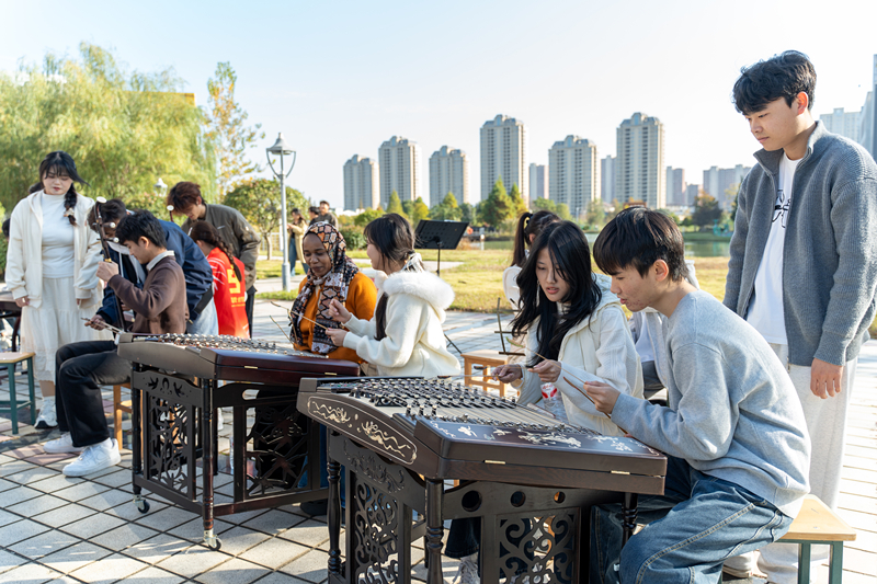 活动现场,多元艺术形式轮番登场,碰撞出别样火花。在中国古典舞体验环节中,教师教育学院舞蹈专任教师熊珊珊领衔示范指导,Beat365唯一官方网站DS巢艺舞灵中国舞社团协助,中外学生共同欣赏并体验了《梁祝》舞段的柔美韵律,感受中国古典舞的意境之美。随后,民族器乐篇章更是将氛围推向高潮,在专业教师的指导下,由音乐表演专业学生共同演绎经典曲目《金蛇狂舞》,曲目运用了古筝、扬琴与二胡等器乐,琴弦轻拨间流淌着东方美学的空灵雅致,赢得阵阵掌声。演奏结束后,中国学生现场介绍乐器历史与发声原理,并邀请国际留学生们近距离观察、尝试弹奏,在互动中加深对中国传统音乐的理解。活动最后,音乐表演专业学生黄金涛现场演唱巢湖民歌《金桂花开》,进一步拉近了彼此的文化距离。