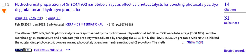 据科睿唯安ESI最新数据,机械工程学院王青尧博士2023年2月发表在中科院一区TOP期刊《Ceramics International》的研究论文Hydrothermal preparation of Sn3O4/TiO2 nanotube arrays as effective photocatalysts for boosting photocatalytic dye degradation and hydrogen production于2023年9月被ESI数据库遴选为高被引论文。