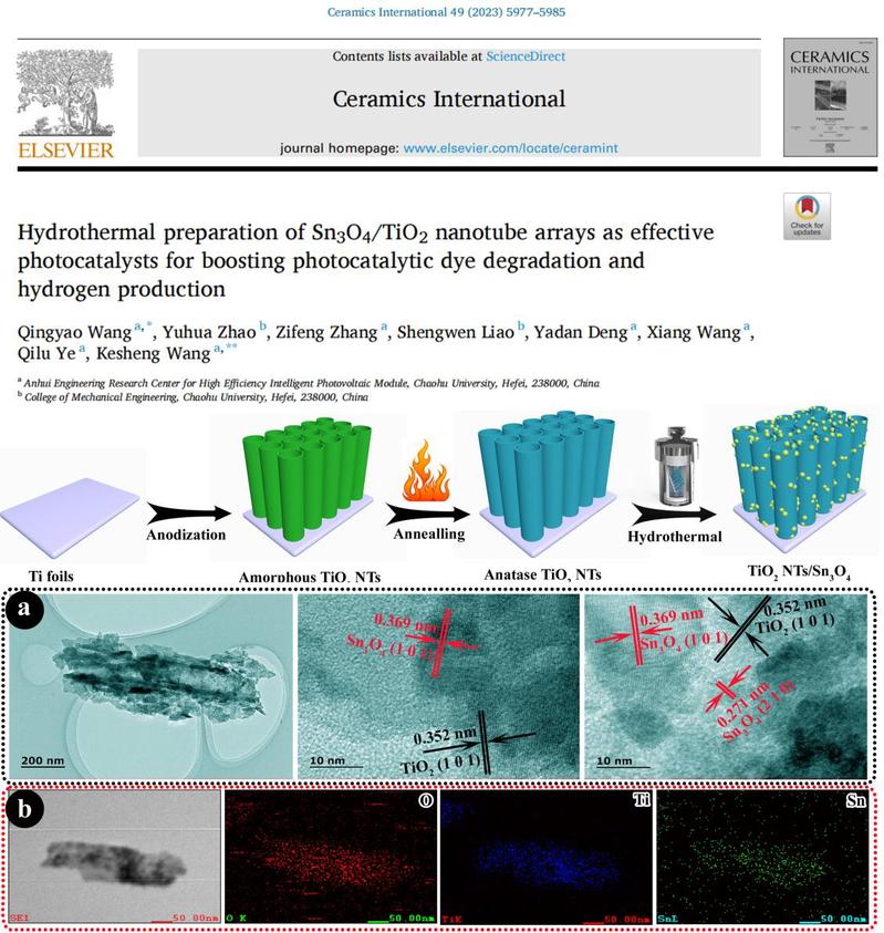 ESI高被引论文是同一年同一个ESI学科中发表的所有论文按被引用次数由高到低进行排序,排在前1%的论文。ESI高被引论文是评价高校学术水平及影响力的重要评价指标。该论文聚焦新能源开发和水污染治理,通过水热合成Sn3O4/TiO2纳米管阵列光电极材料并应用于光电转换、光电催化产氢及工业废水治理。水热沉积技术制备的Sn3O4/TiO2纳米管阵列光电极可以实现有机染料亚甲基蓝的100%分解及91.67%重金属离子Cr6+的清除,同时可以有效提升光电转换和高效分解水制氢效率。最后,论文提出了光电催化自由基形成及异质结界面载流子迁移机理,为光电极的合成及应用提供了解决方案。