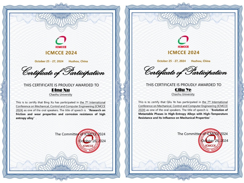 项春在欢迎辞中向与会专家介绍了主办院校的发展情况,并向参会的专家学者表示热烈的欢迎和诚挚的问候。大会分为“力学、控制与人工智能”、“电机系统与电驱动”两个分论坛。会议特邀中国科学技术大学的孙毅研究员、江苏大学的陈前教授、三一集团有限公司的梅斌高级工程师等多名专家分别作主题报告。我校青年教师徐兵、叶奇鲁在大会作题为“Research on friction and wear properties and corrosion resistance of high entropy alloy”和“Evolution of Metastable Phases in High-Entropy Alloys with High-Temperature Resistance and Its Influence on Mechanical Properties”报告,并与与会专家学者展开深入学习与交流。