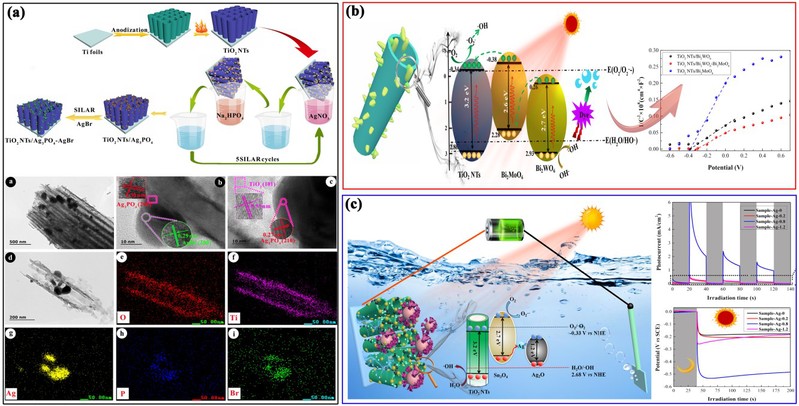 (1)TiO2纳米管阵列薄膜的制备及光电应用。TiO2纳米管阵列的合成、改性和光电性能测试,阐述了纳米粒子组成、形貌和微观结构等对半导体异质界面能带匹配与弯曲、光电子在界面迁移、载流子利用效率方面的微观作用机制。