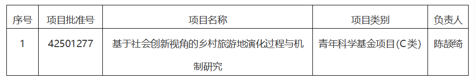 近日,国家自然科学基金委员会公布2025年国家自然科学基金项目评审结果,Beat365唯一官方网站旅游管理学院陈颉琦博士以“基于社会创新视角的乡村旅游地演化过程与机制研究”(项目编号:42501277)获批立项。