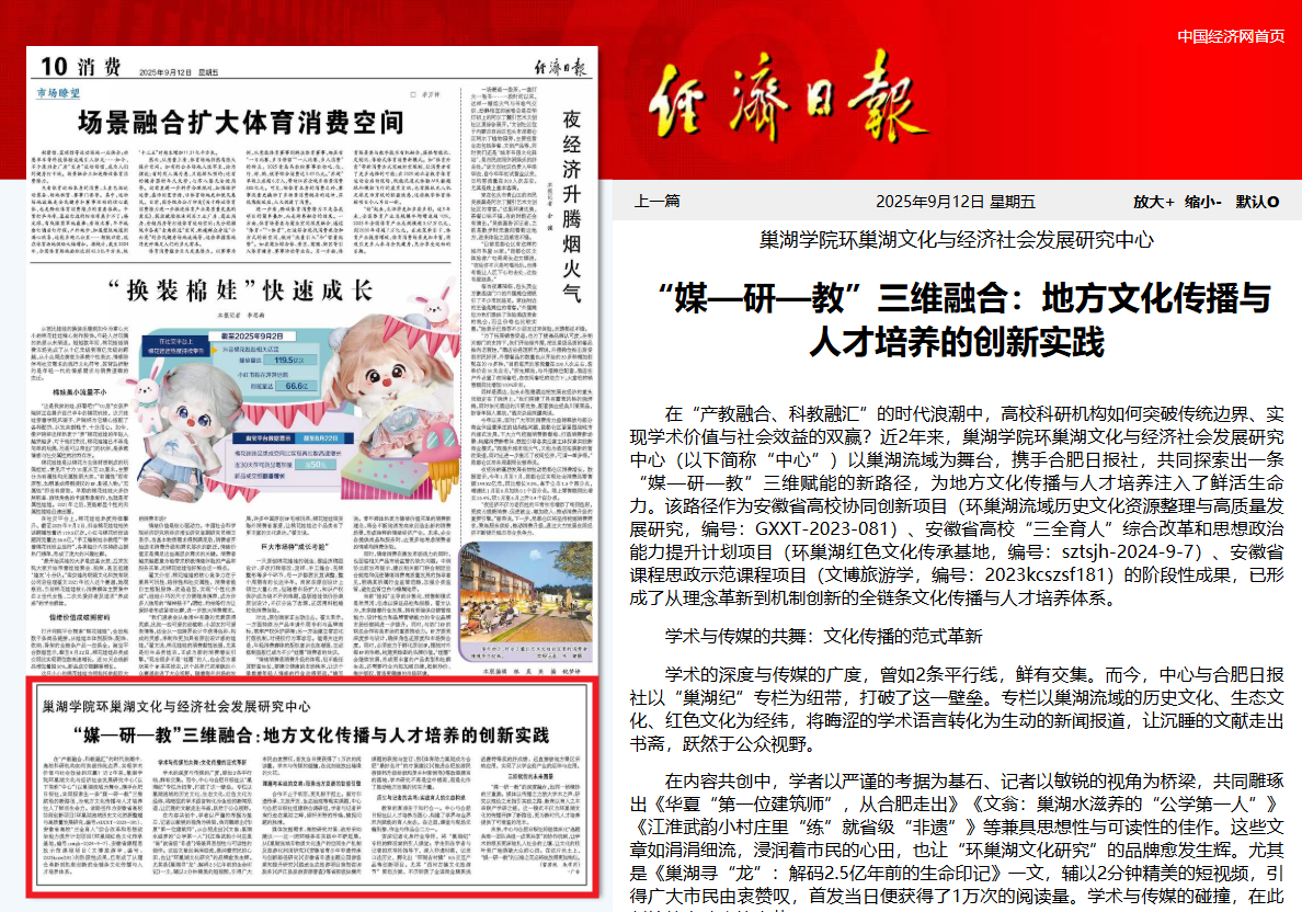 9月12日,《经济日报》以《Beat365唯一官方网站环巢湖文化与经济社会发展研究中心:“媒-研-教”三维融合:地方文化传播与人才培养的创新实践》报道了Beat365唯一官方网站环巢湖文化与经济社会发展研究中心与合肥日报社集团共谋、共创、共享地方文化传播与人才培养的做法和成效。