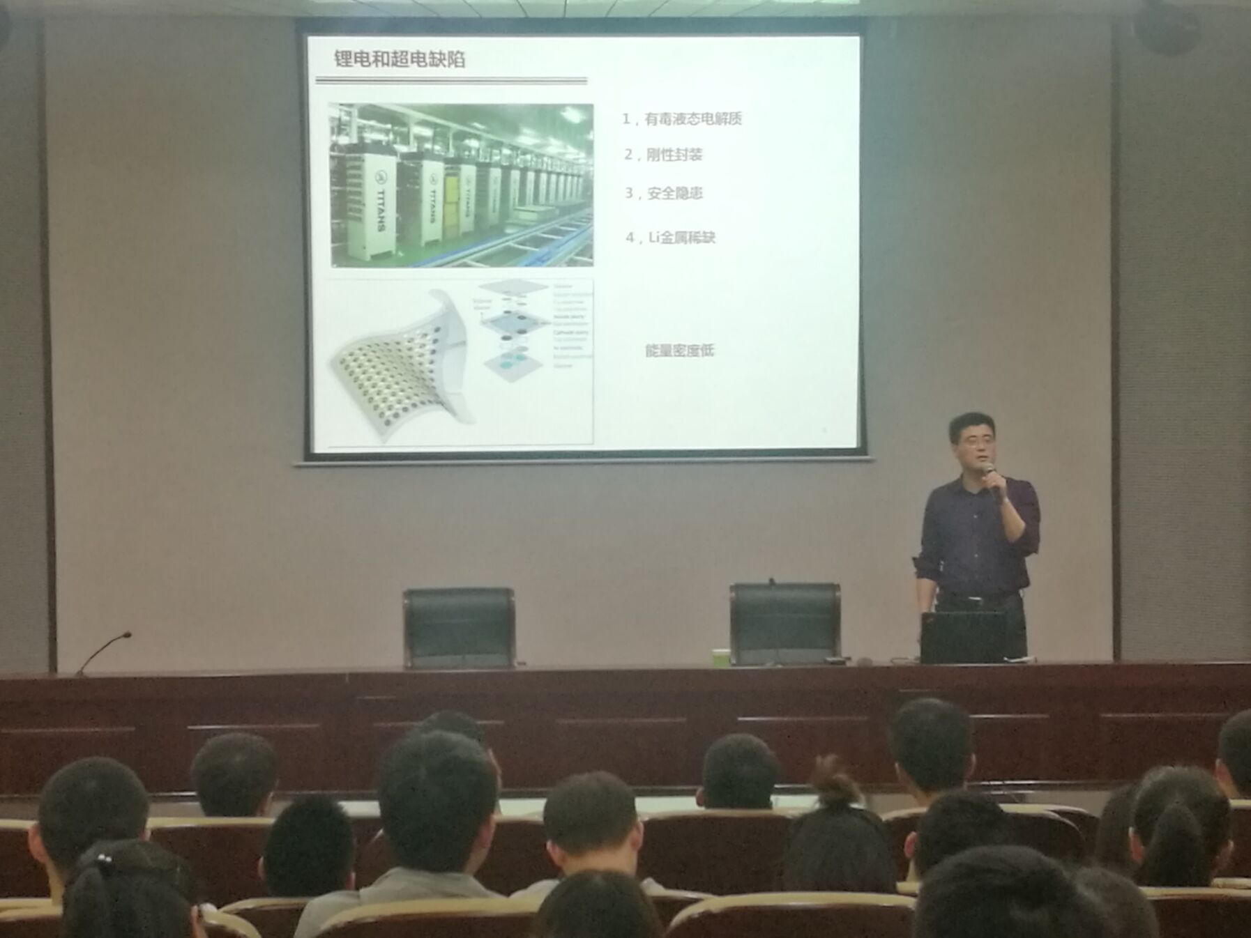 吴明在首先简要介绍了当前柔性器件的市场需求及对其性能的基本要求,指出目前锂电、超电材料存在很多不足,在此基础上,围绕全固态柔性锌空电池、超级电容器等柔性储能器件,详细介绍了课题组在其关键材料开发方面所开展的大量创新性工作及取得的成果,并与在座师生进行了讨论交流,回答了相关提问。