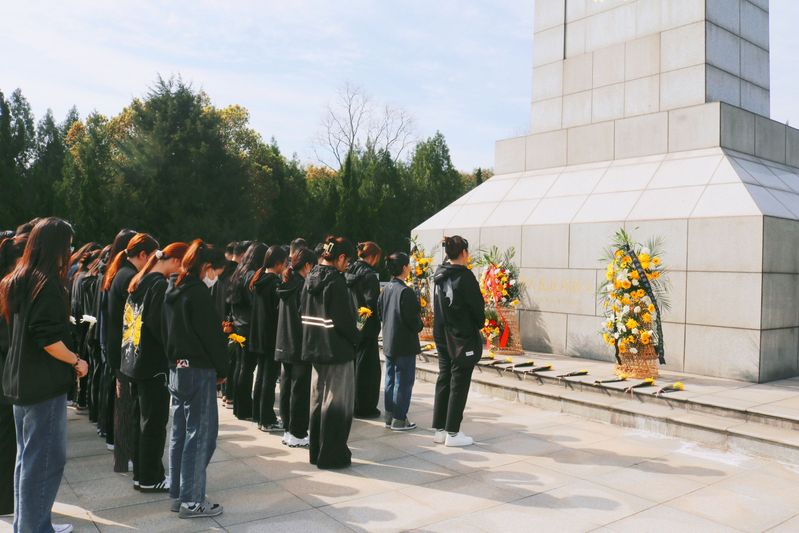 烈士陵园庄严肃穆,党员们在革命烈士纪念碑前肃立默哀,向革命先烈敬献鲜花并鞠躬致敬,深切缅怀革命先烈。 学生党员追寻先烈足迹,从红色革命精神谱系中汲取奋斗力量,涵养爱国情怀,锤炼坚强意志。