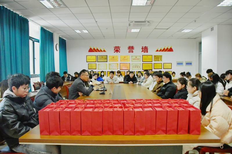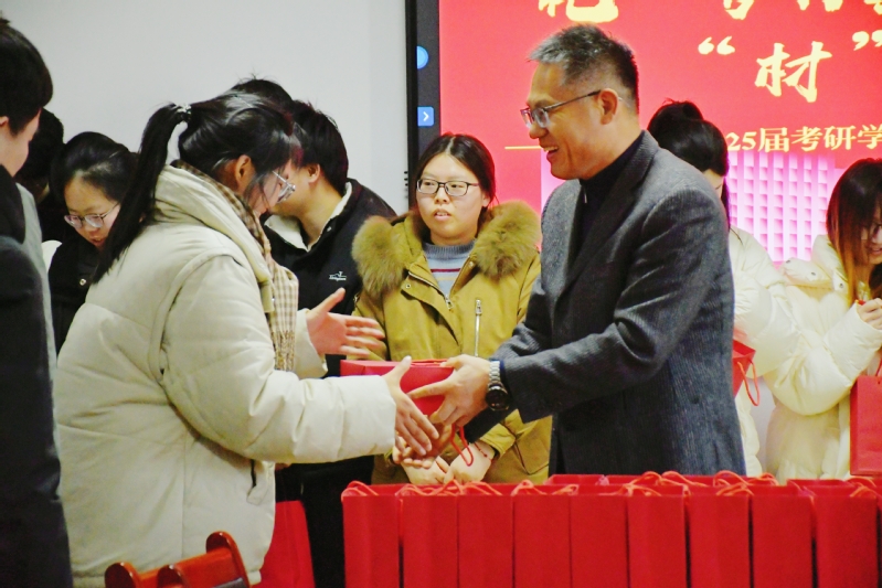 随后,周峰为同学们发放了考研“加油包”。礼包内包含寓意“锦上添花”的毛巾、象征“只争朝夕”的纸巾、寄托“必操胜券”的钢笔、代表“背水一战”的杯子,以及满载祝福的卡片。暖心的礼物传递着学校对考研学子的深切祝愿与殷切期盼。