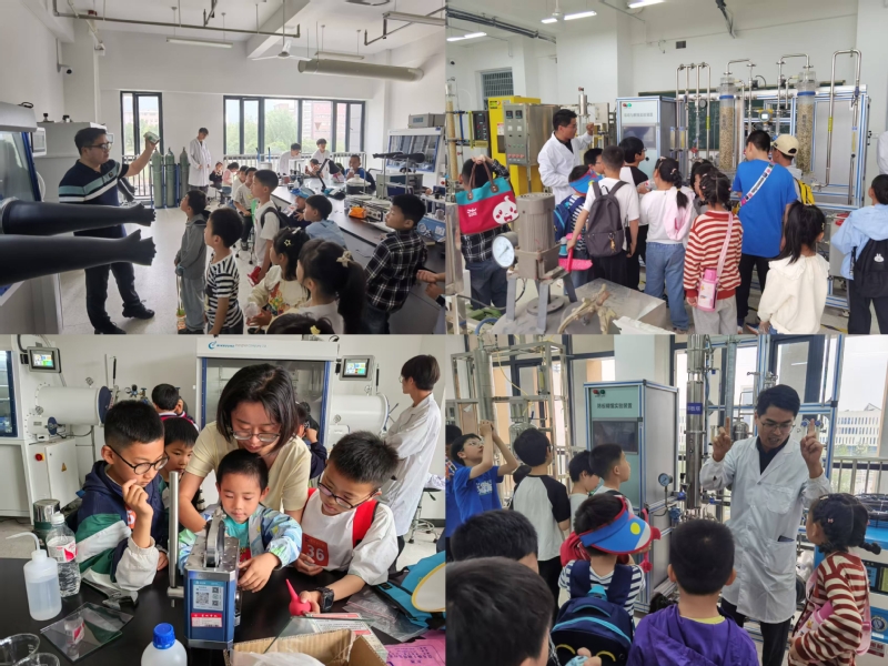 活动伊始,化学与材料工程学院的师生们以温暖的笑容迎接这群小探索者。在热情洋溢的学长学姐引导下,孩子们整齐有序地来到实验室。展现在他们眼前的是一个神奇的化学世界:整齐排列的反应釜、精馏塔、吸收塔、综合传热、循环风洞干燥装置等化工设备,还有用于制作电池的手套箱、压片机等专业设备,在灯光下闪烁着科技的光芒。孩子们睁大好奇的双眼,不约而同地围拢在实验台周围,时而踮起脚尖仔细观察,时而发出惊叹的声音。在老师生动有趣的讲解中,这些平日里看似高深的仪器设备,渐渐揭开了神秘的面纱,为孩子们打开了通往化学世界的第一扇大门。