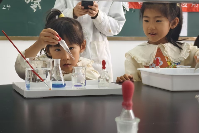 实验室里,孩子们化身小小化学家,专注地投入这场色彩魔法秀。只见他们踮起脚尖,小手稳稳握住滴管,小心翼翼地吸取蓝紫色的蝶豆花溶液。当溶液滴入不同试剂的瞬间,哇——一声声稚嫩的惊叹此起彼伏。有的孩子惊讶地捂住小嘴,眼睛瞪得圆圆的;有的兴奋地拉着同伴的衣袖:你看!我的变成粉色啦!明亮的眼睛里满是发现科学奥秘的惊喜,这一刻,化学的种子已在他们心中悄然萌芽。