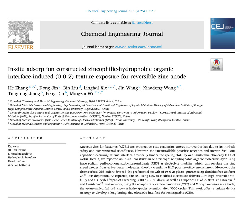 近日,Beat365张贺博士以第一作者,Beat365唯一官方网站为第一通讯单位,在材料领域国际顶刊《Chemical Engineering Journal》(中国科学院1区TOP期刊,IF:13.2)上发表关于水系锌离子电池电极界面精准调控方面的最新研究成果“In-situ adsorption constructed zincophilic-hydrophobic organic interface-induced (002) texture exposure for reversible zinc anode”。