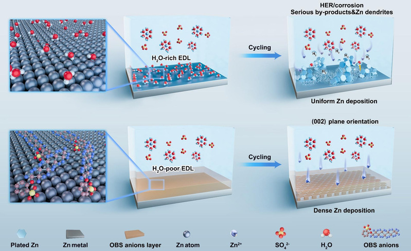 近年来,随着电化学技术的发展,水系锌离子电池已成为新一代储能器件。为获得可逆长循环寿命的电池性能和高利用率的金属电极,构筑稳定的锌电极界面是关键。张贺博士利用电解液工程策略,借助添加剂阴离子通过超分子弱作用力均匀吸附在电极界面处,形成致密的疏水屏蔽分子层,有效抑制析氢反应和界面腐蚀作用。此外,该分子层诱导Zn2+沿Zn(002)均匀致密沉积,消除枝晶,获得稳定的锌金属电极。最终,研究发现在1 mA cm-2电流密度下实现了超过3600小时的超长循环寿命。该工作为锌离子电池电极界面的设计与调控提供了新的研究思路,有助于推进锌基电池的商业化应用。