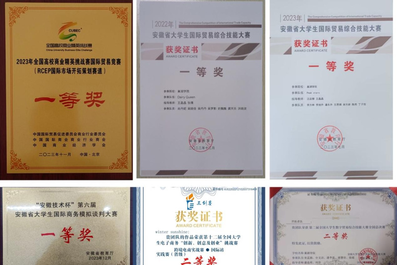 专业注重学生创新创业能力培养,学科竞赛、大创项目、校企合作、校地合作是学生锻炼和展示自己的舞台,专业学生在“互联网+”大赛、全国数字贸易大赛、全国高校商业精英挑战赛、安徽省大学生国际贸易综合技能大赛、安徽省大学生模拟国际商务谈判大赛等国家、省级赛事上,凭借扎实的专业知识和创新思维,均取得了优异的成绩!