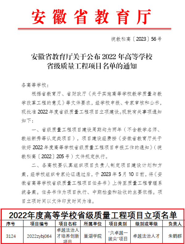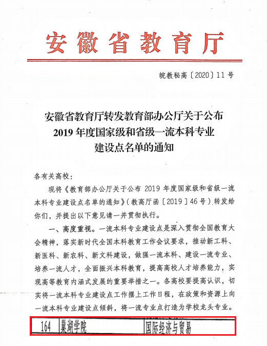 围绕安徽省十大新兴产业发展,学院积极推进学科专业优化调整,进一步发挥“应用经济学”校级重点学科龙头和引领作用,以“上水平、出高水平成果”为目标,积极打造高水平创新平台,促进高水平成果产出。国际经济与贸易专业获批省级一流本科专业建设点;法学专业获批省级卓越法律人才建设专业和校级特色专业,并被列入省级“六卓越一拔尖”培养计划;金融工程专业获批省级振兴计划建设专业,并于2024年6月顺利通过长三角新文科教育专业认证。