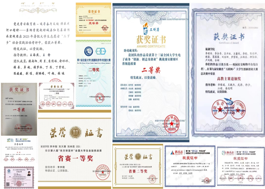通过完善的质量保障体系和有效的教学过程质量监管机制,学生培养质量得到显著提升。近5年,学生获省级以上各类学科竞赛奖项460余项,其中包括全国管理决策模拟大赛特等奖(第一名)、全国金融与证券投资模拟实训大赛一等奖、“天欣杯”中国裁判文书写作大赛全国二等奖、安徽省大学生商务谈判大赛特等奖、安徽省大学生国际贸易综合技能大赛一等奖、安徽省金融投资创新大赛一等奖、安徽省模拟法庭大赛季军等。学生获批国家级大创项目16项,发表学术论文26篇。