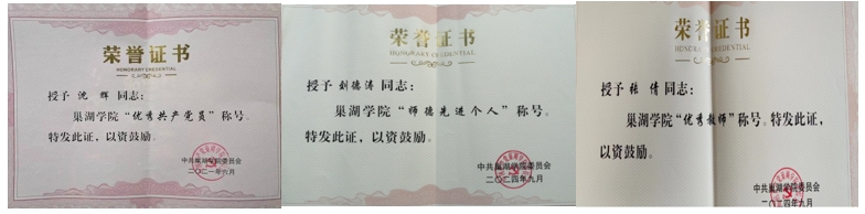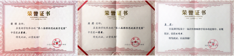 学院大力弘扬教育家精神,紧紧围绕立德树人这一根本任务,深入学习“人民教育家”、“时代楷模”、新时代教书育人楷模、优秀教师、模范教师、最美教师等先进事迹。近年来,学院2人获得省级“线上教学新秀”,20余人次获得校级“师德先进个人”、“优秀教师”、“优秀教育工作者”等荣誉称号,1名教师的先进事迹入选学校师德先进案例,1名教师获得校级“我心目中的好老师”,1人获得巢湖市“同心奋进跟党走”先进个人等荣誉。