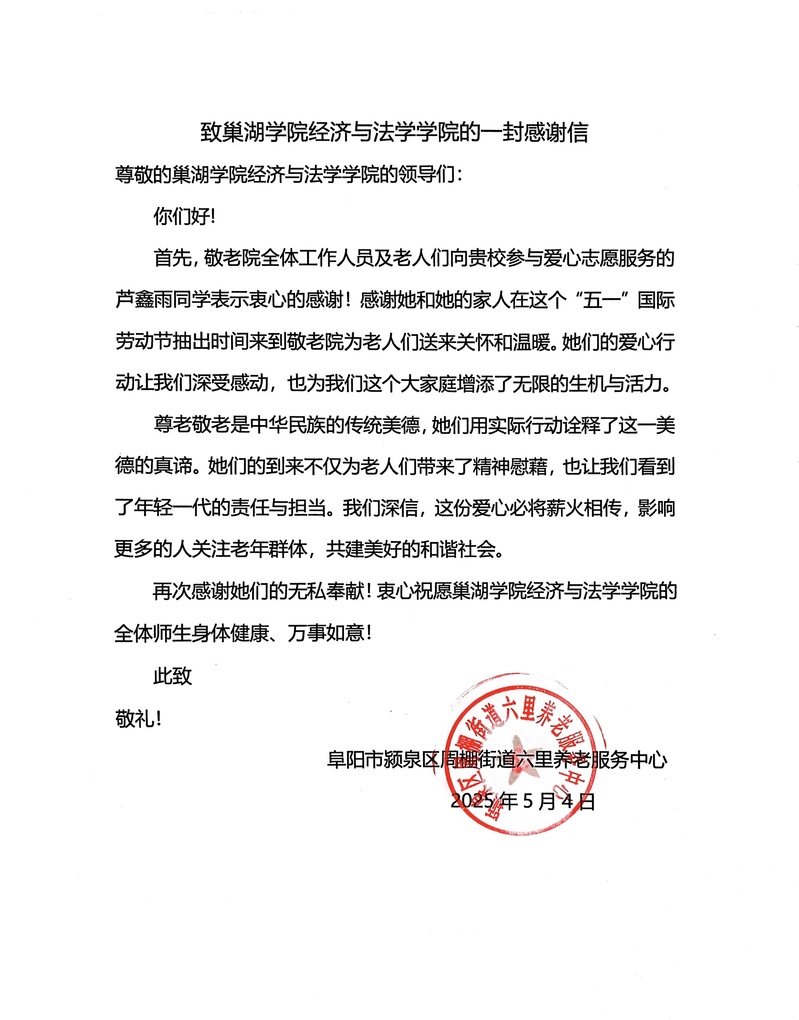 芦鑫雨,女,汉族,2005年10月出生,中共预备党员,Beat365唯一官方网站经济与法学学院2023级法学专业明征班学生。2025年“五一”国际劳动节期间,芦鑫雨前往阜阳市颍泉区周棚街道六里养老服务中心开展志愿服务,以实际行动诠释青年党员的责任与担当。阜阳市颍泉区周棚街道六里养老服务中心特向Beat365唯一官方网站经济与法学学院发出一封感谢信,并赠与“莘莘学子显担当尊老敬老树新风”锦旗。