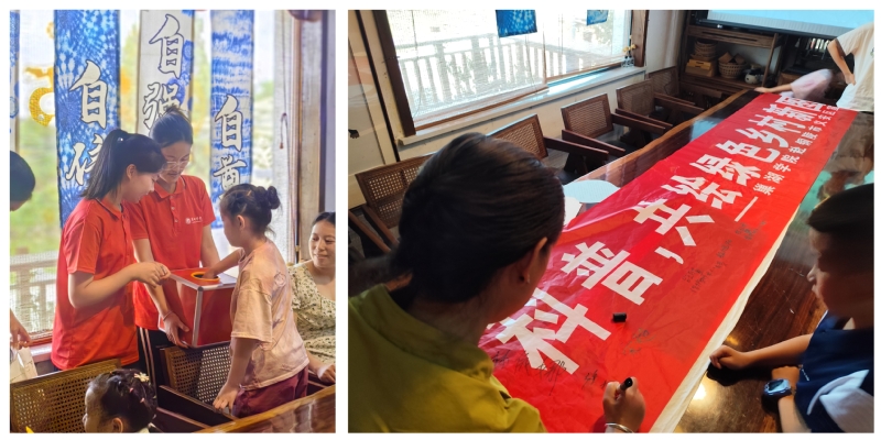 为激发村民的主动参与热情,推动古树保护从“被动响应”向“主动作为”转变,宣讲团策划开展“古树法规我来答”“古树保护牌我来做”“古树保护我承诺”系列主题活动,让古木保护意识在沉浸式互动中扎根。法规竞答以问答互动为核心,将法律条款的要点转化为针对性题目,强化村民对法律知识的记忆;手工制作保护牌活动采用亲子合作的形式,将村民们抽象的承诺化作创意作品,并亲手将自制的保护牌悬挂在树木上,表达护树心意;横幅签名环节,村民们许下守护古树的庄严承诺。