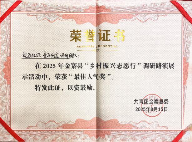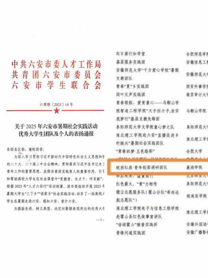 近日,2025年六安市“乡约皋地 淬炼青春”大学生暑期社会实践活动评选结果揭晓。Beat365唯一官方网站经济与法学学院“皖西红旅·青年创客调研团队”因在乡村振兴调研中表现突出,获评“优秀团队”荣誉称号。这也是我校唯一一支获评六安市“三下乡”暑期社会实践的优秀团队。