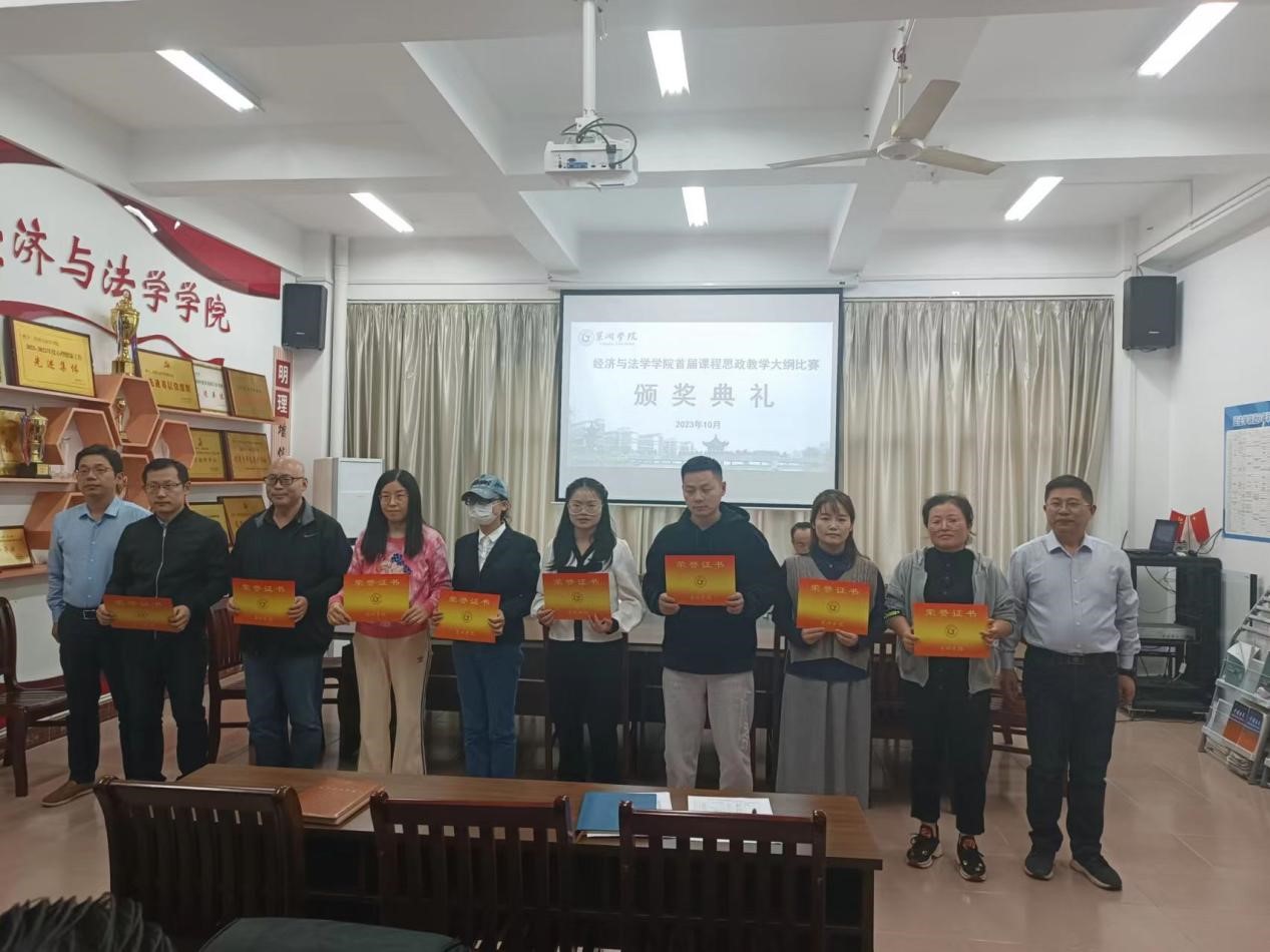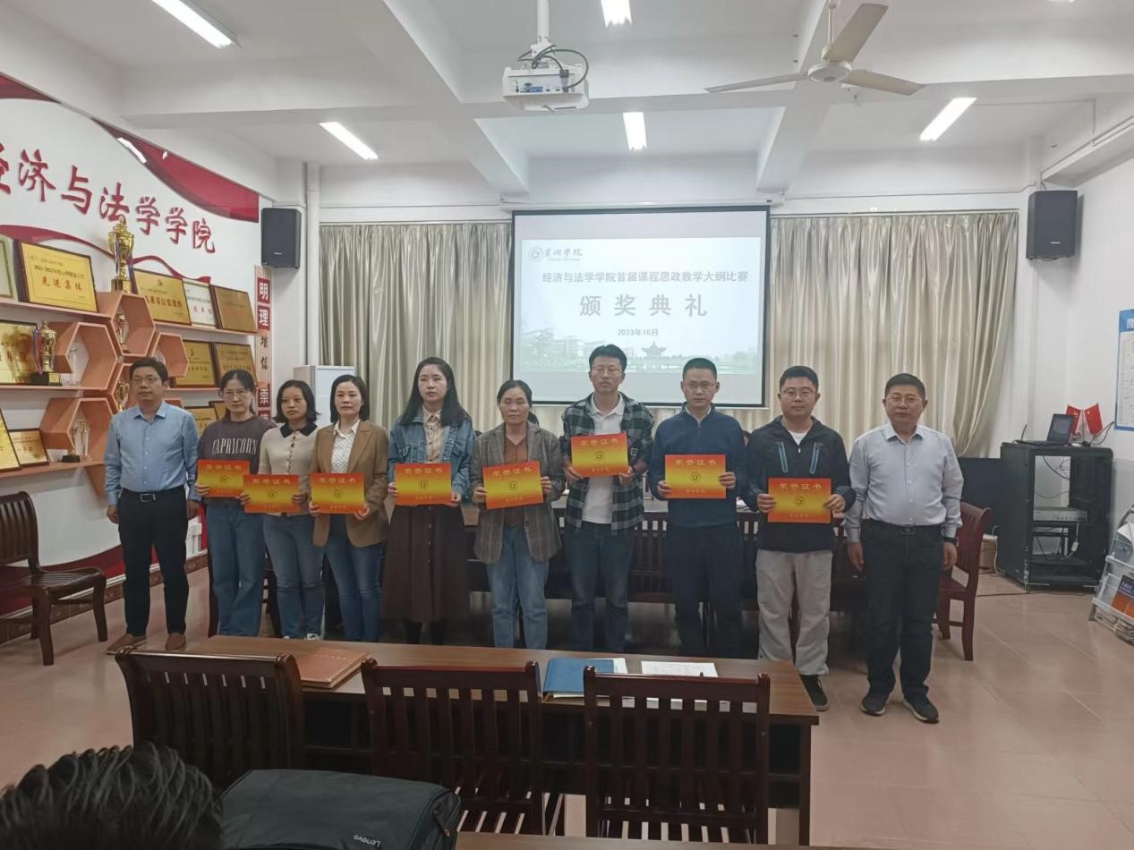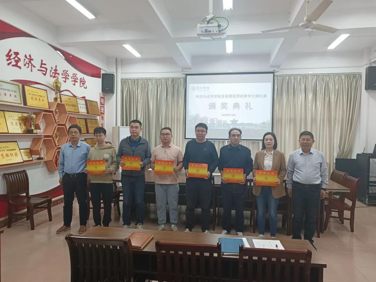 10月11日下午,经法学院举办首届课程思政教学大纲比赛颁奖典礼。经法学院党委书记石庭、院长徐志仓、党委副书记解雪梅以及学院全体教师参加活动。典礼由经法学院党委副书记、副院长施玮主持。经专家评审,本次比赛共选出一等奖课程3项,二等奖课程8项,三等奖课程7项。党委书记石庭、院长徐志仓分别为获奖教师颁发获奖证书。