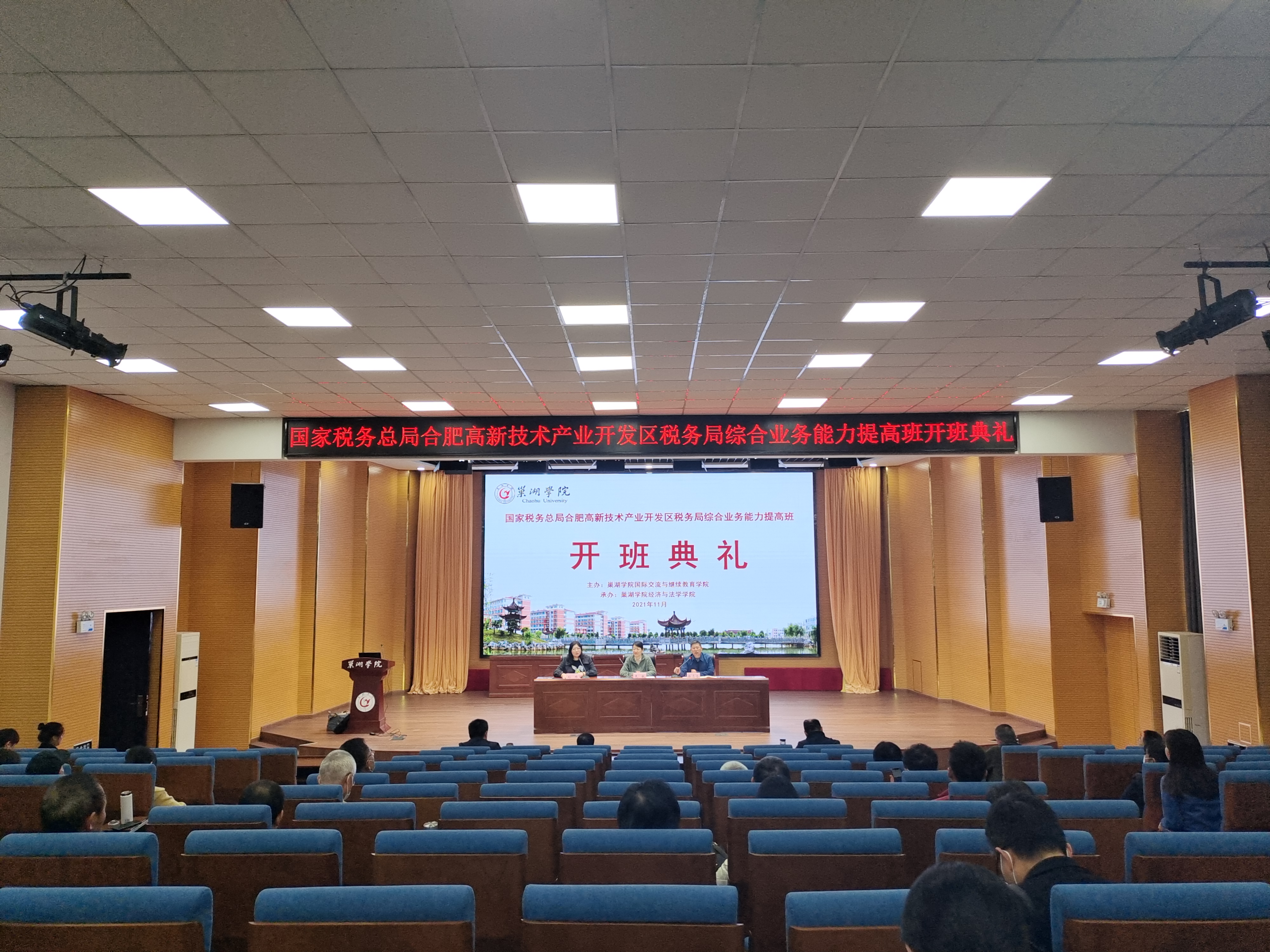 11月19日上午,国家税务总局合肥市高新区税务局2021年综合业务能力提高班在Beat365唯一官方网站求实楼报告厅举行开班典礼。本次培训会由Beat365唯一官方网站国际交流与继续教育学院主办,Beat365唯一官方网站经济与法学学院承办。合肥市高新区税务局党委委员、副局长竞敏、经济与法学学院院长徐志仓、经济与法学学院副书记孙玮出席开班典礼,开班典礼由孙玮主持。
