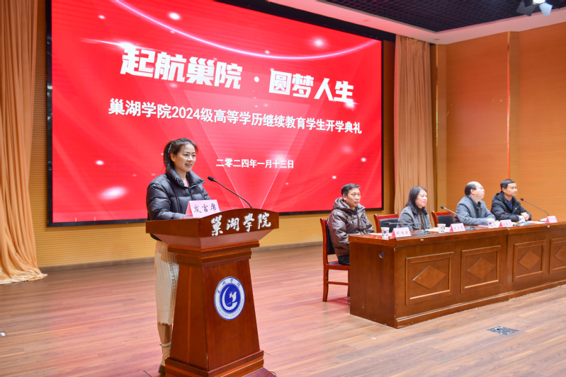 1月13日上午,巢湖学院高等学历继续教育2024级新生开学典礼在求实楼报告厅举行。校党委委员、副校长朱定秀,教务处副处长胡传双、相关教学学院领导及班主任,国际交流与继续教育学院工作人员和2024级新生参加了典礼。典礼由国际交流与继续教育学院副院长齐先文主持。