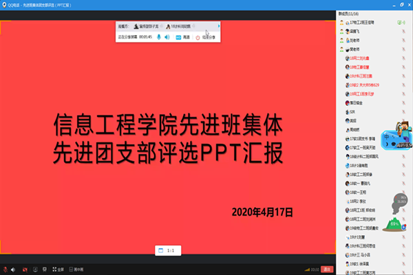为引领学院广大青年学子树立和践行社会主义核心价值观,充分发挥先进班集体和团支部的示范作用,检验“班团一体化”制度实施效果,4月17日下午,信息工程学院通过线上汇报的方式开展“先进班集体、先进团支部”评选活动。信息工程学院团总支书记刘小燕、团总支副书记何平老师以及全体辅导员担任评委。19-17级共19个班集体参与汇报评选。