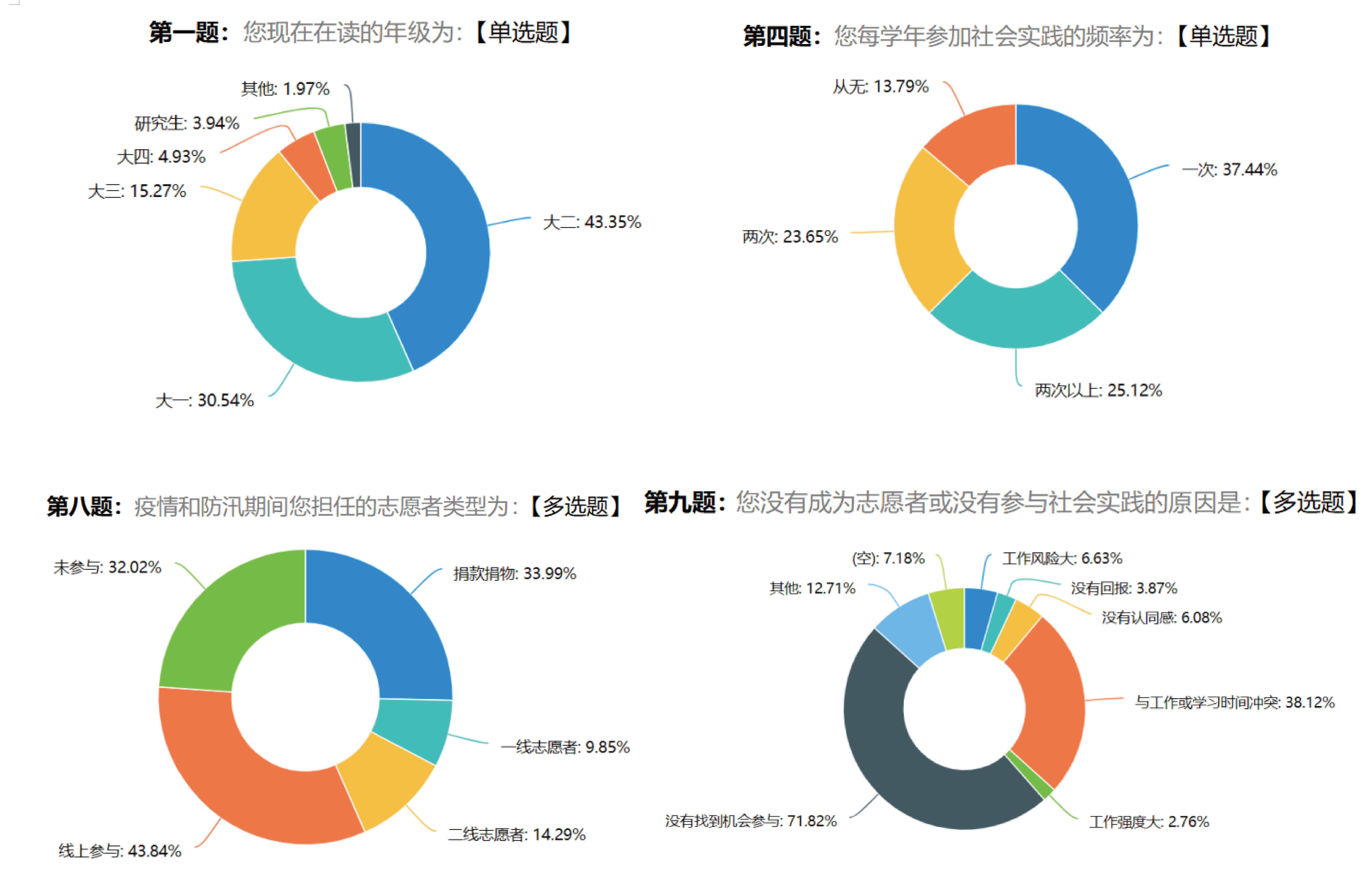 活动期间,实践团队通过线上完成了对大学生返乡实践和防疫抗洪期间参与志愿服务情况的问卷调查。问卷基于防疫抗洪的社会背景,细分为三个模块。一是对个人基本信息的收集;二是了解大学生防疫抗洪期间参与志愿服务和社会实践的基本状况;三是收集对于大学生参与社会实践和志愿服务的建议。