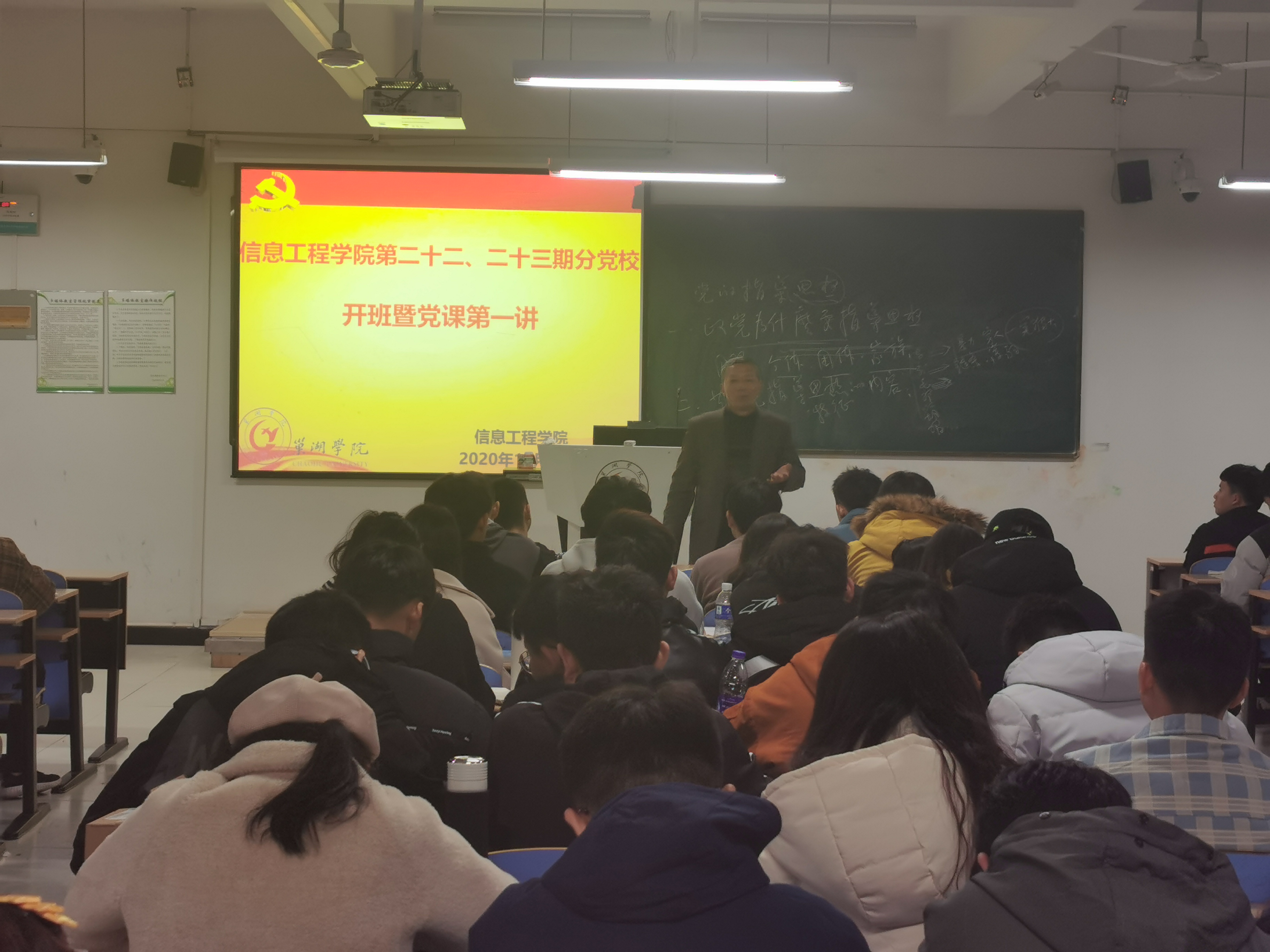 为学习贯彻习近平新时代中国特色社会主义思想和党的十九届五中全会精神,进一步提高入党积极分子对党的认识,明确入党目的,端正入党动机,坚定理想信念,信息工程学院于2020年11月30日18:30在慎思楼中104教室举办2020年秋季党课开班典礼暨党课第一讲,本次会议由信息工程学院党委书记陈士群主讲,党课班主任樊乐乐和本期所有学员参会。