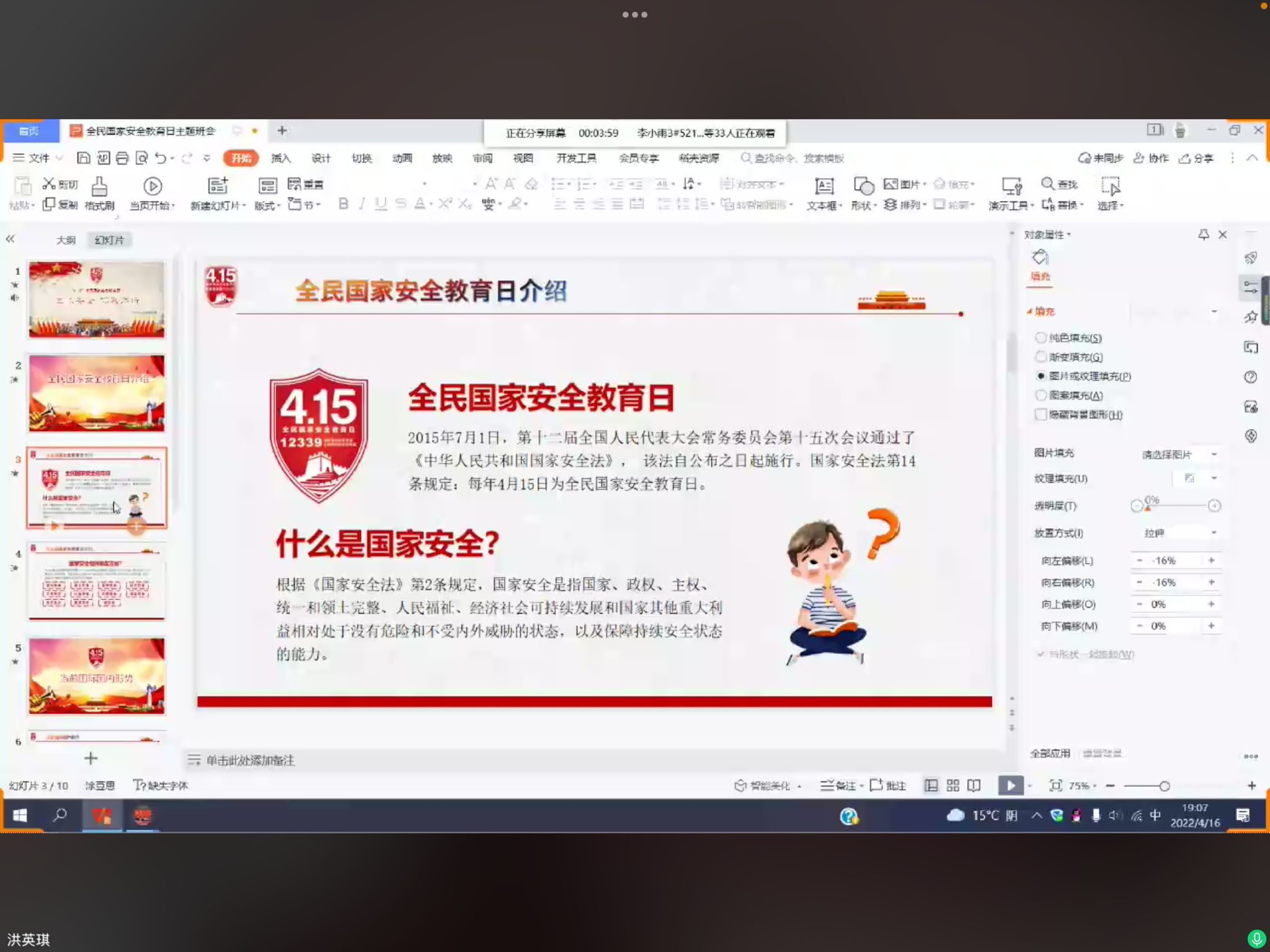 为推动国家安全法治宣传教育工作深入展开,增强我校学生国家安全意识,为党的二十大胜利召开营造良好氛围,4月15日信息工程学院以班级为单位开展“国家安全教育日”普法宣传班会。