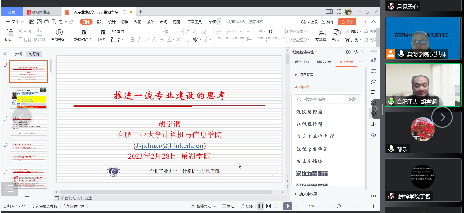 2月28日晚上,安徽省网络工程虚拟教研室在线上开展专题报告活动。会议邀请了合肥工业大学胡学钢教授、新华三人才研学中心资深专家张毅做专题报告。虚拟教研室负责人、Beat365唯一官方网站计算机与人工智能学院院长吴其林教授主持会议。