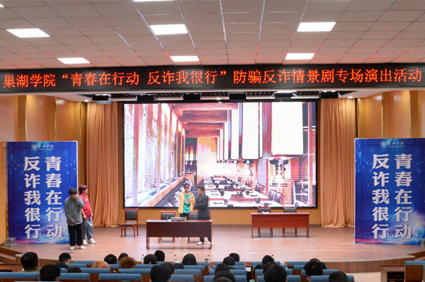 为进一步强化校园反诈宣传教育、普及反诈知识,提高学生识骗防诈能力,营造校园反诈防骗的浓厚氛围,4月26日下午,由保卫处、学生处、团委主办,计算机与人工智能学院承办,雷雨话剧社协办的主题为“青春在行动反诈我很行”反诈防骗情景剧专场演出在求实楼报告厅开演。宣传部、学生处、保卫处、团委、合肥市公安局巢湖经开区分局、半汤街道领导,各二级学院副书记及辅导员、学生代表共同观看演出,演出活动同步进行线上直播。